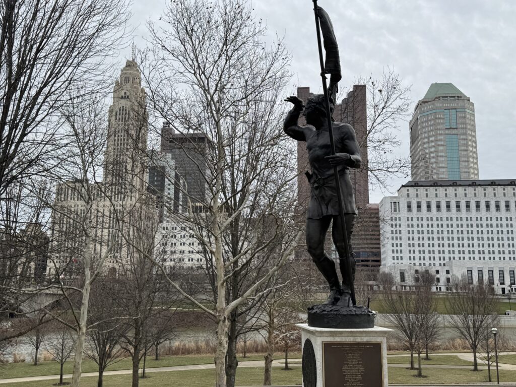 Sources: Columbus – the story of a city by Ed Lentz, 2003; A historical guidebook to old Columbus by Bob Hunter, 2012; Columbus – America’s Crossroads by Betty Garrett w Ed Lentz, 1980; Columbus Neighborhoods – A guide to Landmarks by Tom Betti, Ed Lentz and Doreen Uhas Sauer, 2013; Lucas Sullivant, City of Columbus, www.columbus.gov; Franklinton historical marker to be restored by Tyler Buchanan, July 20, 2023, www.axios.com; As It Were by Ed Lentz, 2013; Harrison House and Sullivant Land Office, Columbus Historical Society, www.columbushistory.org; History Lesson: Lucas Sullivant, Pioneer of Franklinton by Doug Motz, Jan 17, 2012, www.columbusunderground.com; Daniel Boone, Biography, American Battlefield Trust, www.battlefields.org; Daniel Boone’s Kentucky, www.kentuckytourism.com; www.america250-ohio.org; As America turns 250, embrace all our history, warts and all by Todd Kleismit, Guest Columnist, Dec 9, 2025, www.dispatch.com; The featured picture is the Lucas Sullivant statue dedicated on May 6, 2000. It sits on the west bank of the Scioto River very near where he founded Franklinton in 1797.