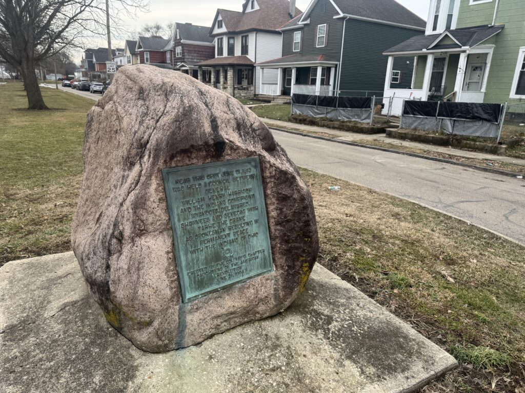 The Harrison Rock is a site marker for the critical 1813 meeting between General Harrison and Native Americans. It sits in the middle of a neighborhood on Columbus’ short west side, not too far from the Harrison House.