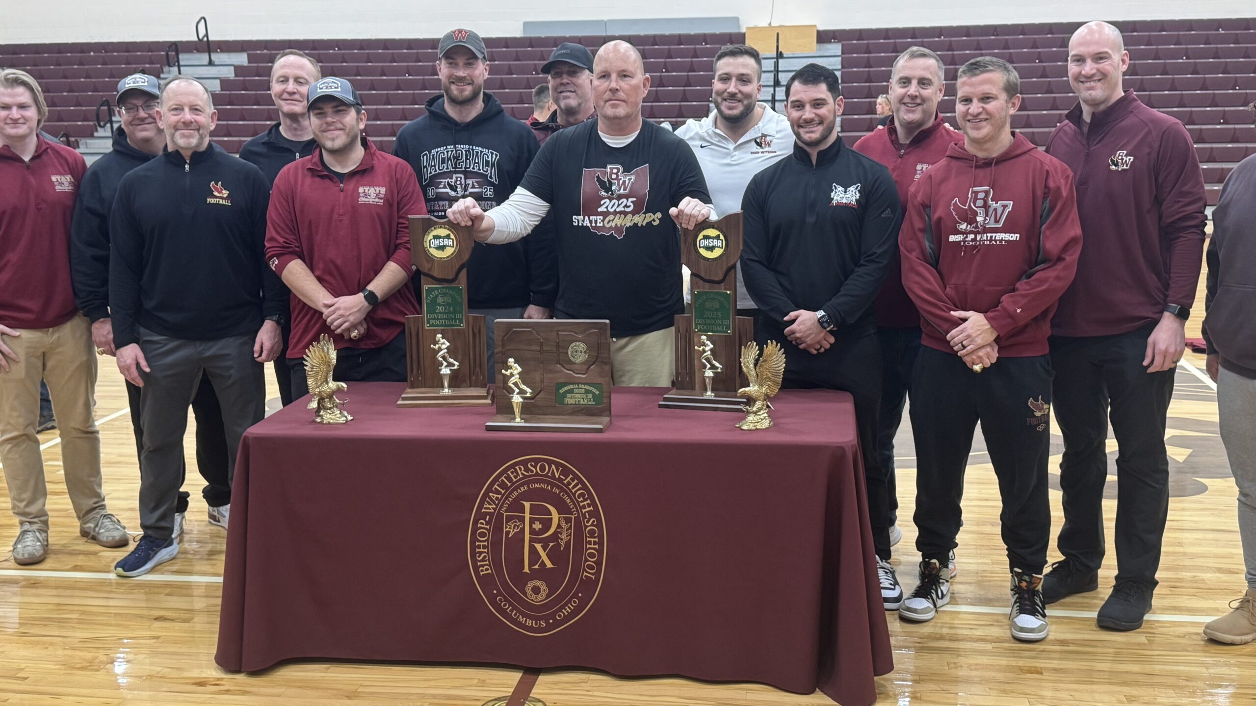 Sources: Bishop Watterson High School state football title celebration, Sunday, December 7, gymnasium; Watterson football cruises to OHSAA state championship repeat by Frank DiRenna, Dec 5, 2025, www.dispatch.com; www.orthopedicone.com; Playoffs by Timothy L Hudak, www.ohsaa.org; Polls by Timothy L Hudak, www.ohsaa.org; Popularity by Timothy L Hudak, www.ohsaa.org; Watterson vs Arlington 1966 commemorative video Pt – 3, www.youtube.com; Central Ohio’s high school football state champions by Dave Purpura, Dec 4, 2024, www.dispatch.com; Former Watterson coach Dick Walker dies, Jan 15, 2013, www.dispatch.com; Remembering one of the good guys by Steve Hemmelgarn, Feb 7, 2013, The Parkersburg News & Sentinel, www.newsandsentinel.com; Kennedy grateful for the chance to coach Watterson by Jarrod Ulrey, Jan 31, 2017, www.dispatch.com; Strong work ethic sustains record-breaking season for Watterson head coach, DLA division chief by Stefanie Hauck, Jan 22, 2025, www.dla.mil; Wikipedia; Featured picture is Coach Brian Kennedy seconds before winning his first state championship in December, 2024, courtesy Spectrum One.