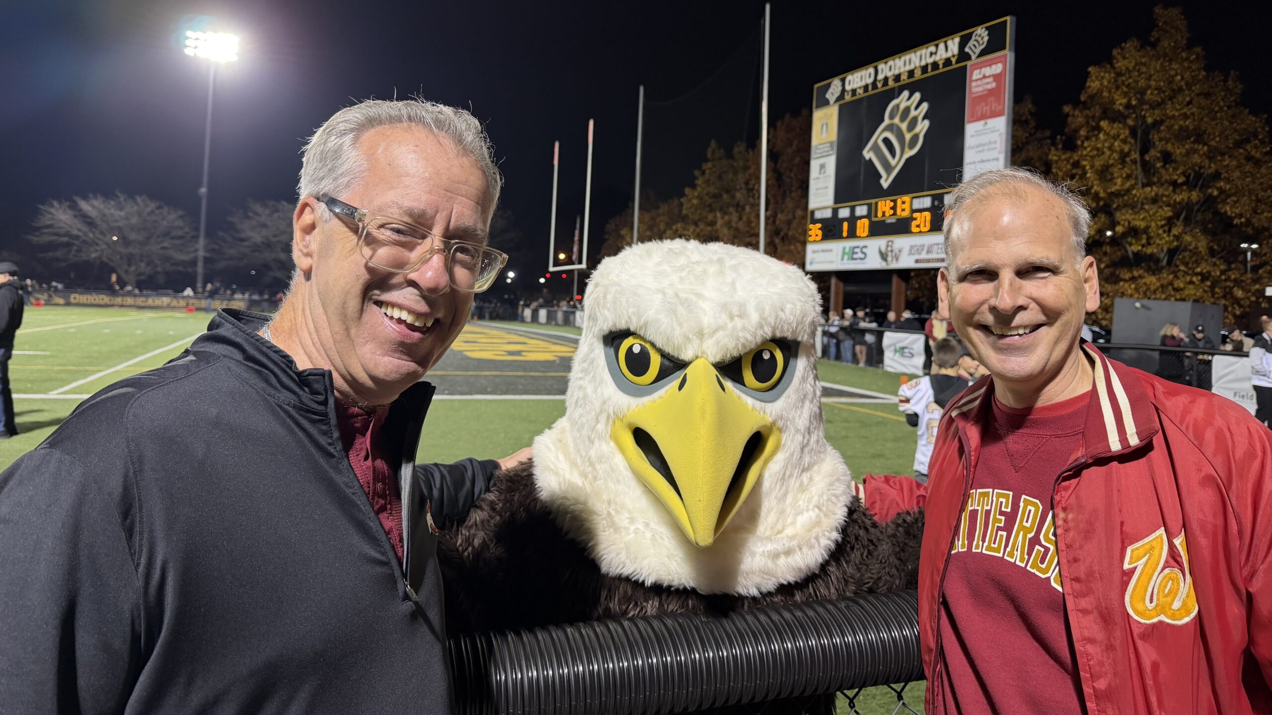 Two 1979 Watterson High School alumni with the Eagle mascot at a playoff game in November, 2025.