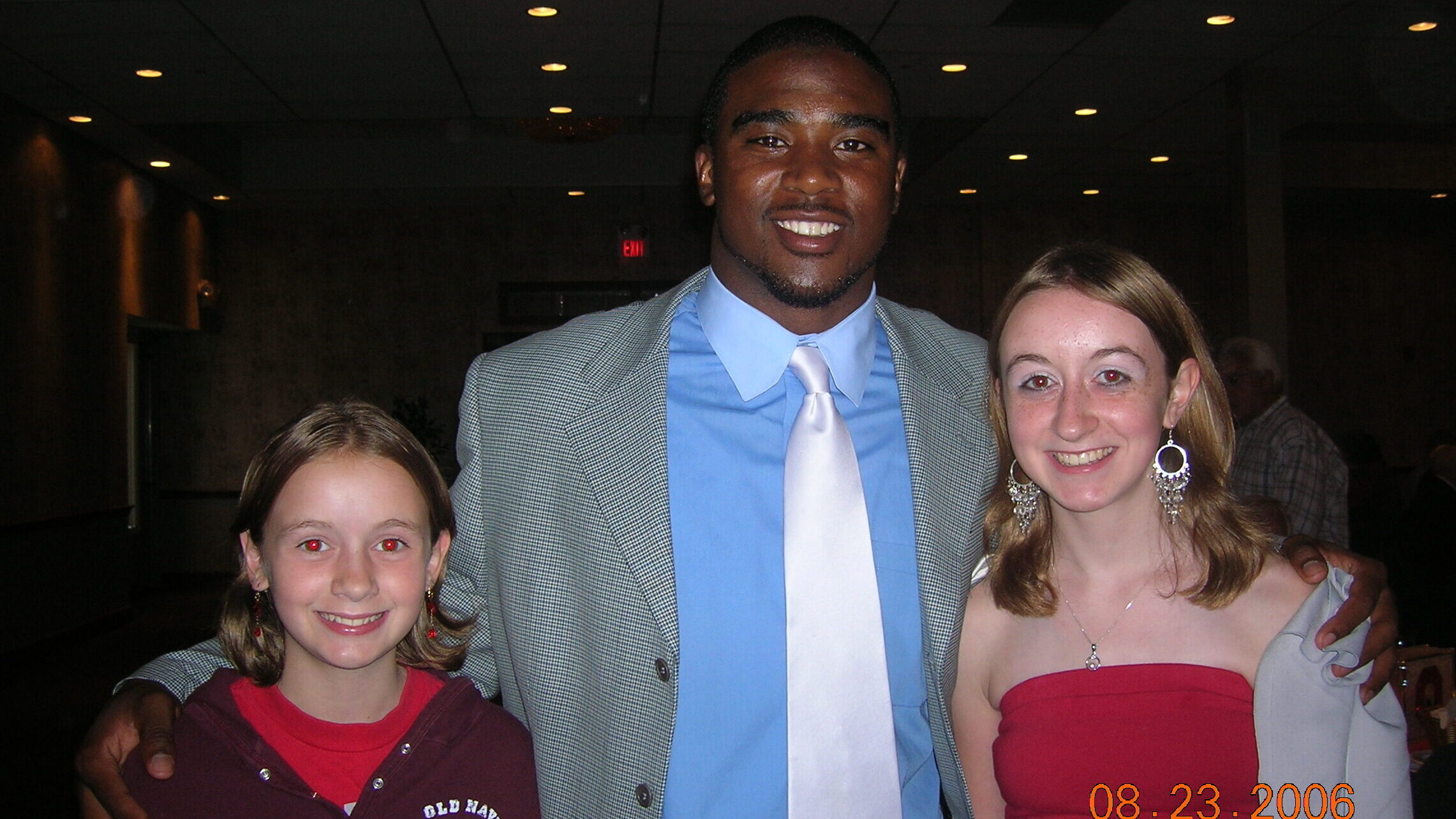 Troy Smith posing with 11-year-old Nicole and 14-year-old Natasha at the Buckeye Boosters pre-season banquet in 2006, the year he won the Heisman Trophy.
